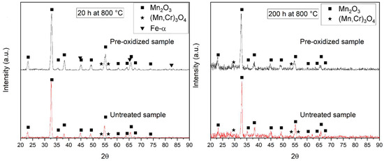 After oxidation, the same oxides were detected with XRD analysis in treated and untreated samples at all exposure times. The results at the shortest (20 h) and longest (200 h) exposure times are used to illustrate this behavior (Figure 4). The main difference between the results at 20 and 200 h is the easier identification of Fe-α and M3O4 peaks. These structures are located below the external Mn2O3 oxide (as seen in the EDS images) and were observed in previous investigations into this alloy system [20,21,22], which thickens with exposure and thus makes it harder to detect the inner layers. The M2O3 peaks seen in Figure 2 disappeared, which may be a sign that the oxide formed during the pre-treatment is richer in Cr than the oxide formed at the test temperature, but Mn content in the oxide layer quickly began to increase. The formation of Cr2O3 in the oxide layers of FeMnSiCrNi alloys was pointed out as the main factor responsible for the increase in oxidation resistance seen after vacuum annealing [21]. However, the absence of these crystalline peaks in Figure 4 shows that this effect might be specific to the early oxidation stages, after which the oxide composition approaches that of the untreated samples and Cr2O3 disappears or becomes harder and harder to detect. This could explain the first parabolic kinetics stage seen in pre-treated samples (Figure 3b). The main mechanism of oxidation protection here seems to be the same one observed during vacuum annealing: the presence of a Mn-depleted layer facilitates Cr participation in the oxidation process, leading to the formation of a more protective layer and an overall increase in oxidation resistance.