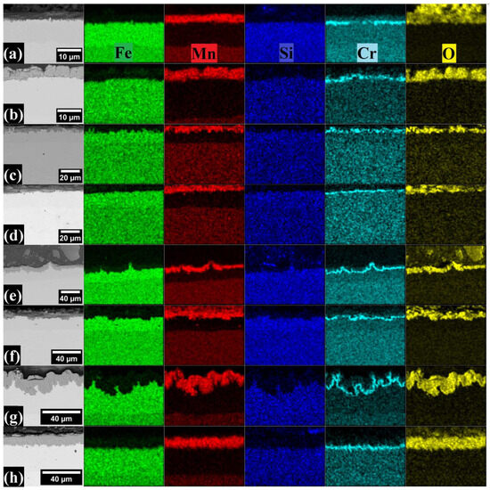 The SEM/EDS analysis confirms that the pre-treatment did not drastically affect the oxide layer configuration, as seen in the Fe, Mn, Cr, Si, and O EDS maps shown in Figure 5. The oxide layer, in all test conditions, was composed of an external Mn-rich oxide, followed by a Mn and Cr-rich oxide layer between the external layer and the substrate. In both cases, a heavy Mn depletion is seen on the substrate (ferritic layer). Cr is also slightly depleted in the ferritic layer. As a result, Fe, Si, and Ni (not shown here) appear enriched.