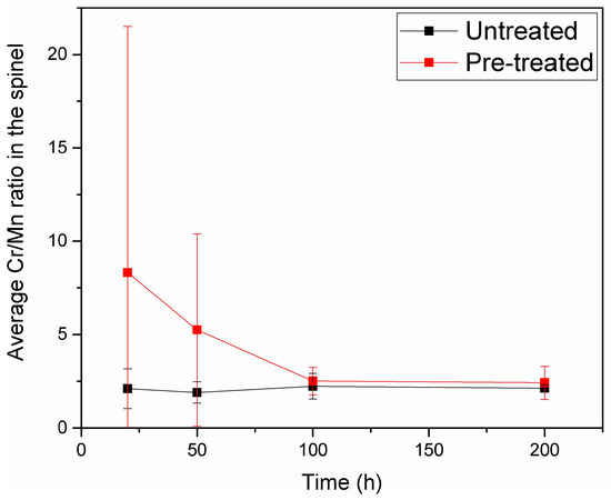 Spot EDS measurements performed in several regions of the spinels also show that they are, on average, richer in Cr in the pre-treated samples at 20 and 50 h of exposure. These average values are shown as a function of exposure duration in Figure 6 for treated and untreated samples. The Cr content is not well-distributed in these conditions, which explains the large error bars seen in the figure. At 100 and 200 h, the Cr content seems to be more stable and is only slightly higher than in the untreated samples. For the untreated samples, the Cr content in the spinels remains mostly stable throughout the 200 h of exposure. This result indicates that spinels richer in Cr might be responsible for the increased oxidation resistance during the first 50 h of exposure. This Mn enrichment of the spinel layer during exposure was already reported in the vacuum-treated samples [21]. The reaction of the Cr oxide with Mn to form spinels is also responsible for the changes seen in Figure 6. Even though XRD analysis is no longer able to detect Cr oxide, dispersed particles might still be present for the first 50 h, causing the increased Cr signal in some of the measurements. This would be in agreement with a previous study that has shown that chromia can be present as discontinuous particles inside the spinel layer [33]. Both Cr oxide formation and Cr/Mn ratio alterations in the spinels seem to contribute to the formation of a more protective spinel layer. However, although both pure Cr oxides and Mn–Cr–O spinels are more protective than pure Mn oxides, they are not barriers for Mn diffusion. This is especially true for this case, in which the continuous Cr-rich scale is formed mainly by Mn–Cr–O spinels, which is even less efficient in slowing Mn than pure chromia. The chromia formed after 20 and 50 h of oxidation, although probably efficient in slowing Mn diffusion, is present only as discontinuous particles, severely reducing its protective capabilities. In summary, because the Cr-rich layer in these samples is unable to sufficiently reduce Mn activity, it allows the formation of Mn-rich oxides in the oxide layer. After 100 and 200 h, the only Cr-rich oxide layer left contains only spinels that are richer in Mn and is, therefore, even less capable of reducing Mn diffusion.