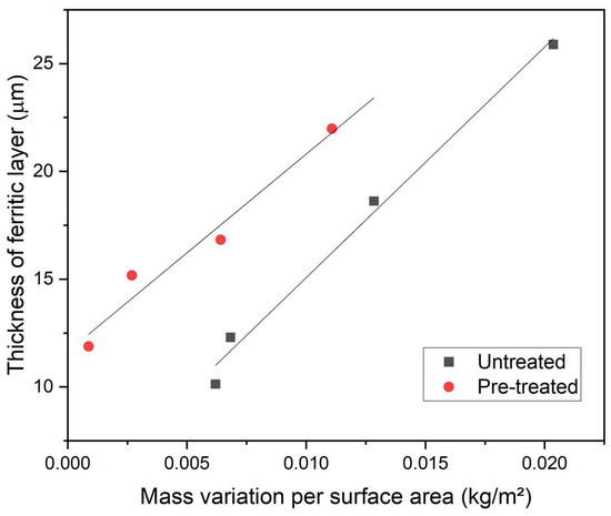 Average ferritic layer thickness per mass variation for pre-treated and untreated samples. A line fit shows that the ferritic layer thickness increases linearly with the mass variation.