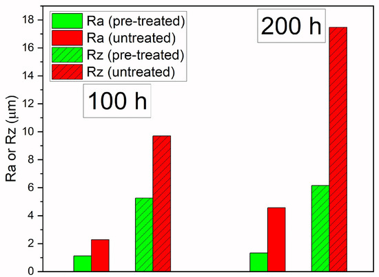 A major difference between the behaviors of pre-treated and untreated samples is the metal/oxide interface roughness. The Ra and Rz roughness of samples exposed to 100 and 200 h were measured and are shown in Figure 8. The results from the samples exposed to shorter times were omitted, as low interfacial roughness could not be accurately measured via the digital image analysis employed. The results show that the metal/oxide interface roughness is much higher in untreated samples, and the difference increases from 100 to 200 h. A previous study has shown that the roughness increase in these samples occurs due to the inwards growth of Mn oxides and is beneficial for spallation resistance [20], but a higher interface roughness can increase stress in oxide layers [35,36]. This increase should affect the cyclic oxidation behavior of these alloys. In this study, the increased roughness in untreated samples could have promoted the appearance of cracks. These, in turn, would facilitate oxygen diffusion through the oxide layer. The initially more protective layer may have helped to control the inward growth of Mn oxides by acting as a diffusion barrier. Even though this layer is eventually not as protective, its effect at early stages might have been sufficient to delay or even avoid the increase in interface roughness usually seen in these alloys. Furthermore, the amount of Mn consumed in general was lower on the pre-treated alloys, as shown by the lower mass variation. Finally, the result seen here is the opposite of that one obtained with vacuum pre-treatment, in which the pre-treatment caused an increase in surface roughness. Although the authors do not measure roughness evolution along the experiment, some spallation was detected in the treated samples after exposure, indicating that the initial surface roughness was detrimental to oxide adhesion [21].
