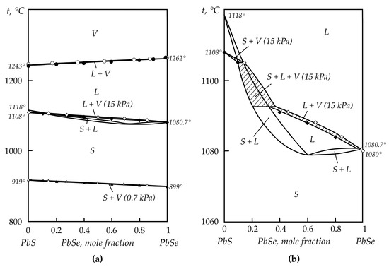 At atmospheric pressure, lead sulfide, selenide, and telluride can be transferred to the vapor phase at temperatures above 1243 °C (PbS), 1262 °C (PbSe), and 1323 °C (PbTe). A pressure decrease to 15 kPa in the PbS—PbSe system is accompanied by a shift in the “condensed phase—vapor” coexistence field to the S + L field (Figure 3b) and divides it into three regions: L + V, S + L + V, and S + L. In the PbS—PbTe system, the L + V field at 15 kPa is located above the liquidus line. When the pressure drops to 0.7 kPa, the equilibrium field “condensed phase—vapor” is superimposed on the solid solutions field. Moreover, the coexistence fields of liquid and solid phases are partially located in the liquid solutions area. In the PbSe—PbTe system, the L+V field at 15 kPa is also located above the liquidus line. When the pressure drops to 0.7 kPa, the equilibrium field “condensed phase—vapor” is superimposed on the field of solid solutions (S), and the coexistence fields of liquid and solid phases are partially located in the area of liquid solutions.