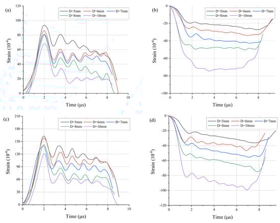 As shown in Figure 6, the transmitted pulses decrease as the specimen diameter decreases. In addition, based on Equation (1), specimen stress () should decrease when the transmitted pulse decreases. However, Figure 8 demonstrates that the overall stresses increase as the diameters increase. This is because the cross-sectional area of the specimen () acted as a more dominant factor in Equation (1).