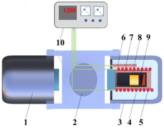 Schematic of the centrifugal apparatus: (1) Counterweight, (2) Centrifugal axis, (3) Heating furnace, (4) Refractory materials, (5) Resistance coil, (6) Thermocouple, (7) Furnace chamber, (8) Graphite crucible, (9) filter, and (10) temperature controller.