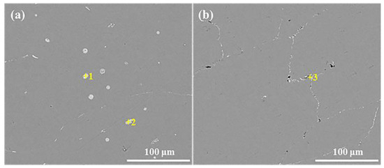Figure 2 presents the SEM images of the original material with marked analyzed phases, and their corresponding elemental compositions are listed in Table 2. It can be seen that the gray phase represents the Al matrix, while the gray and white spherical eutectic particles correspond to the Fe-rich phase. At the grain boundary, the white particles were the Al13Fe4 phase, composed of 76.80 at.% Al and 23.20 at.% Fe. Additionally, the black areas denote the presence of shrinkage holes in the raw material.