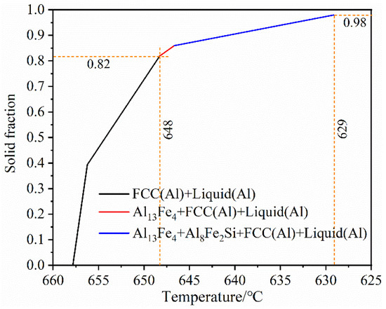 The Scheil solidification model in Thermo-Calc was employed to obtain the solidification path of 1060 industrial pure Al in this study, as shown in Figure 3. The results indicate that the α-Al phase started to solidify at 658 °C, followed by the Al13Fe4 phase at 648 °C. Subsequently, the Al8Fe2Si phase precipitated at 646 °C, and the temperature decreased to 629 °C, at which point the industrial pure Al was completely solidified. Therefore, traditional supergravity separation techniques (utilizing density differences between different phases in a high-temperature molten state for impurity removal) have limited efficacy and cannot accomplish one-step separation. To achieve the solid–liquid separation of the sample and, thereby, purify the industrial pure Al, the subsequent experimental temperatures were set between 648 °C and 658 °C. Specifically, the Al matrix serves as the solid phase, while the Fe-rich impurities act as the liquid phase. However, as observed in Figure 3, within this temperature range, the solid phase in the sample is relatively high and the natural settling time is long. Previous studies [15] have revealed that during the solidification of the sample when the solid phase fraction reaches 0.2, dendritic networks begin to form (interpreted as a continuous solid skeleton). The permeability and fluidity of the mushy zone decrease. When the solid phase fraction exceeds 0.2, it results in the hard separation of the liquid phase at the grain boundaries from the matrix under normal gravity. Techniques such as squeezing or other methods are necessary to allow the interdendritic liquid to flow out from the dendritic network. Therefore, this section proposes a semi-solid supergravity method for purifying industrial pure Al, that is, the liquid Fe-rich impurity phase is separated from the Al sample under the supergravity field.