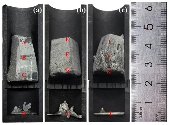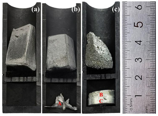 Macro diagram of the sample at th = 40 min, ts = 3 min for different experimental temperatures: (a) 648 °C, (b) 653 °C, and (c) 658 °C.