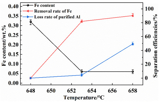Figure 5 shows a line chart of the separation results at different experimental temperatures. It can be observed that as the temperature increased, the Fe content (ωFe_f) in the remaining Al decreased significantly, while the Fe removal rate (ηFe) and the loss rate of the purified Al (RAl) increased significantly. At T = 653 °C, the ωFe_r, ηFe and RAl achieved 0.06 wt.%, 81.9%, and 4.1%, respectively. Although the ωFe_f and ηFe reached 0.05 wt.% and 92.0% at 658 °C, the RAl reached 49.9%.