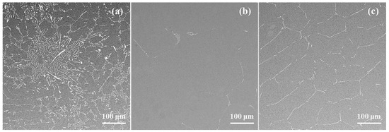 Microstructure of sample at th = 40 min, ts = 3 min for different separation temperatures (corresponding to Figure 4 marked as “A–C”): (a) the sample filtered to the lower crucible at 653 °C, and the upper (b) and lower (c) positions of the sample filtered to the lower crucible at 658 °C.