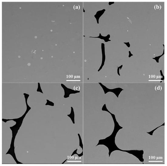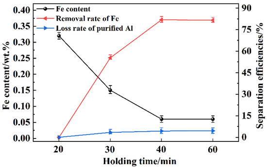 The high-purity Al collected in the upper part from the different holding times was subjected to electron microscopic analysis at typical locations, as shown in Figure 9. At th = 20 min (Figure 9a), the results showed that during the sample melting process, the Fe-rich phase was essentially present as spherical eutectic particles in the sample compared to the raw material (Figure 2). This indicates that during the sample melting process, the Fe-rich phase dissolved, was broken, and spheroidized into small droplets before solidifying into the Al matrix at T = 653 °C. However, the Fe-rich phase could not be removed. When the holding time was increased, the amount of liquid phase in the grain boundaries increased and filtered to the lower part of the crucible, forming holes, as shown in Figure 9b–d. Meanwhile, it can be seen that the Fe-rich phase distributed in the Al matrix decreased, indicating that the Fe-rich phase in the Al matrix migrated to the grain boundary. At th = 40 min and 60 min (Figure 9c,d), only a very small amount of residual Fe-rich phase was distributed in the Al matrix, and almost all of the spheroidized Fe-rich phase in the Al matrix had migrated to the grain boundary. This is because the equilibrium distribution coefficient (k0) value of Fe impurities is 0.03, which is defined as the ratio of impurity concentration in the solid (CS) to that in the liquid (CL). This means that the solubility of the Fe-rich phase in the solid phase is much smaller than that in the liquid phase [29,30]. It has been shown that Fe impurity elements at the solidification interface of the Al melt can be continuously moved to the liquid. Furthermore, the greater the difference in the k0 value of the impurity from 1, the more significant the purification effect. Here, the k0 value of Fe impurities is much smaller than 1. Thus, the Fe-rich impurities in the Al matrix continuously migrate towards the liquid phase near the grain boundaries [29,31]. Ultimately, there is almost no presence of Fe-rich impurities in the Al matrix at th = 40 min and 60 min. Considering the separation efficiency and energy consumption comprehensively, th = 40 min was selected as the optimal holding time.