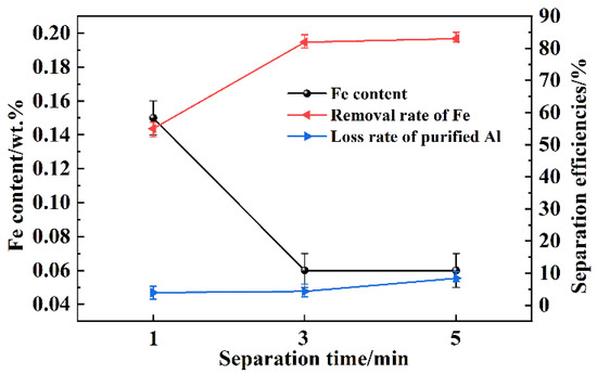 Figure 11 shows a line chart of the separation results at T = 653 °C and th = 40 min for different separation times. It can be observed that as the separation time increased from 1 min to 5 min, the ωFe_f decreased from 0.15 wt.% to 0.06 wt.%. Additionally, the values of ηFe and RAl increased from 55.0% to 83% and from 3.7% to 8.1%, respectively.
