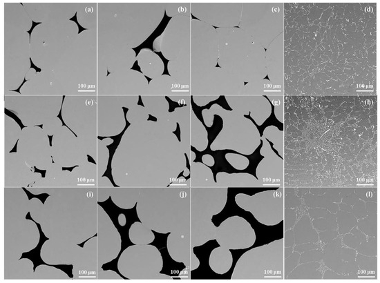 Microstructure of the sample at T = 653 °C, th = 40 min for different separation times (corresponding to Figure 10 marked as “A–L”): (a–d) 1 min, (e–h) 3 min, and (i–l) 5 min.