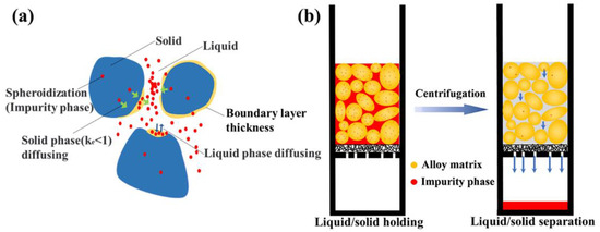 According to the above experimental results, it can be seen that the method of purifying pure Al is similar to the mechanism of purification by unidirectional solidification/segregation, which is based on the fact that impurities have different solubility in the liquid or solid phases of metal [12,16]. The schematic diagram of the purification process using supergravity in the semi-solid state is shown in Figure 13. Impurity elements at the solidification interface of the melt can be continuously moved to the liquid or solid phase depending on their equilibrium distribution coefficient (k0), that is, the greater the difference of the k0 value of the impurity from 1, the more significant the purification effect. However, there is a variance between the k0 and the actual distribution coefficient. Thus, the actual distribution coefficient is defined as the effective distribution coefficient (ke). The melting–solidification equilibrium equation of the impurity elements in the purification process is as follows [13]: