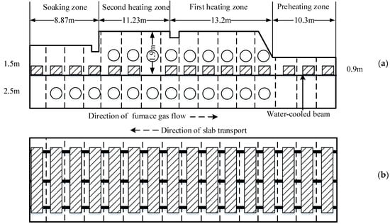 With the proposals of “carbon peaking and carbon neutrality”, reducing fuel consumption has become an urgent task for industrial technological innovation. In China, the industrial furnace bears the brunt of reduction in fuel consumption owing to its only 30% thermal efficiency but almost 1/4 of the total energy consumption of the country [1,2,3]. As an important equipment prior to hot rolling, the main function of a reheating furnace is to raise the temperature of a slab to the softening point as high as 1200–1350 °C. In order to improve the thermal efficiency of a furnace, reduce its fuel consumption and improve the heating quality of a slab, the temperature and temperature uniformity of the slab and the temperature of the exhaust gas must be effectively controlled [4].