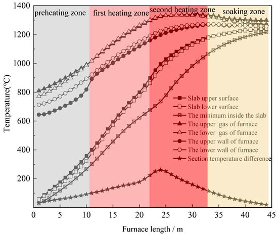 - Increasing the relative length of the preheating section reduced the exhaust temperature but could not effectively reduce the section temperature difference in the slab. Increasing the relative length of the soaking zone reduced the section temperature difference in the slab but could not effectively change the slab temperature and exhaust temperature.