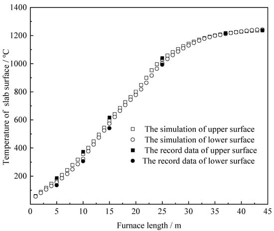 Two sets of temperature data were supplied to verify the validity of the zone model. The first set of data is the predictions from the zone model during which the furnace was operating at 300/h (see Figure 2). In the preheating zone, the section temperature difference in the slab was small and the mean temperature of the furnace gas was not high. This was due to the lack of heat input from the burners and the effect of heat absorption of the cold slab. In the heating zone, the mean temperature of the furnace gas increased with the heat input from fuel, and the section temperature difference in the slab increased. In the soaking zone, the variation in gas temperature along the furnace length and the section temperature difference in the slab were much smaller than those in the heating zone with the decrease in fuel consumption. The second set of data is the temperature values of the upper and lower surfaces of the slab from an instrumented slab trial, as shown in Figure 3. The data were used to verify the simulation results of the zone model, and the simulation results show that there was only 5.9% maximum error. Based on this comparison, the predictions from the zone model proved to perfectly agree with actual measurements, suggesting that the zone model is feasible.
