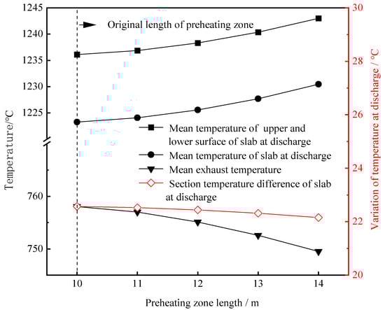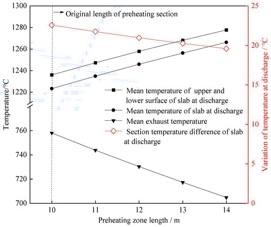 For actual industrial production lines, due to a comprehensive consideration of cost and other related factors, it was suitable to directly increase or shorten the length of the existing reheating furnace. In this case, the “relative length” is defined as the actual length of the furnace zones, which could be changed by adjusting the burning state of the burners. For example, under the premise of guaranteeing a throughput rate and total fuel consumption, when the total length of the preheating zone and first heating zone was fixed, the burners in part of the first heating zone near the preheating zone were turned off or turned down, and then part of the heating zone was transformed into the preheating zone. In this way, the relative length of the preheating zone increased and the relative length of the first heating zone decreased. After this adjustment, the slab temperature and exhaust temperature predicted by the zone model are shown in Figure 6.