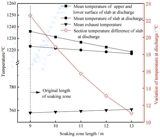 Likewise, when the throughput rate and total fuel consumption were fixed, the total length of the soaking zone and the second heating zone was fixed, the length of the soaking zone increased and the length of the second heating zone shortened. The zone model predictions of the slab temperature and exhaust temperature after adjusting the relative lengths of the soaking zone and second heating zone are shown in Figure 7.
