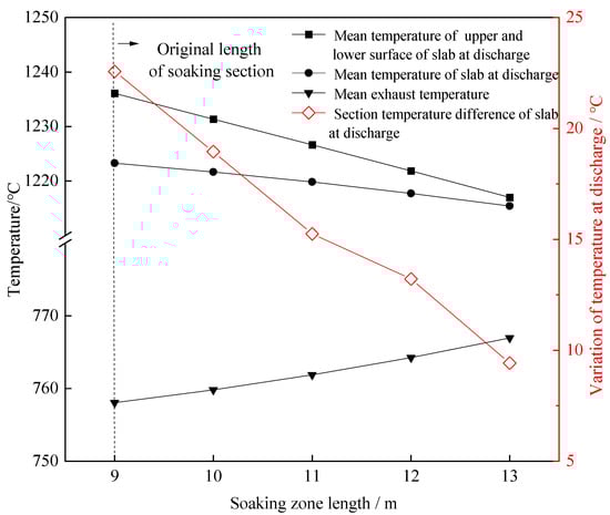 The influences of the lengths of the preheating zone and soaking zone on the slab heating quality and the exhaust temperature at a throughput rate of 300 t/h are shown in Figure 4 and Figure 5, respectively. It can be seen from Figure 4 that when the length of the preheating zone increased by one meter, the slab discharge temperature increased by about 10.75 °C and the exhaust temperature decreased by about 13.29 °C, and the change in the section temperature difference in the slab at discharge can be almost ignored. This indicates that prolonging the length of the preheating zone can reduce heat loss, owing to hot exhaust gas, and hence improve the utilization efficiency of fuel, but cannot effectively reduce the section temperature difference in the slab. Figure 5 shows that the changes in the slab temperature and exhaust temperature were very small with the increase in the soaking zone length, while the section temperature difference in the slab decreased obviously. More specifically, when the length of the soaking zone increased by one meter, the section temperature difference in the slab was reduced by about 2.88 °C.