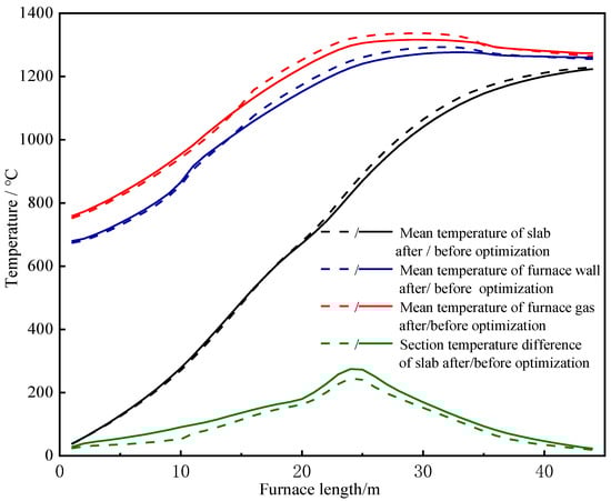 From Figure 8, it can be seen that the temperatures of the furnace gas and furnace wall surface increased in the heating zone and soaking zone but slightly decreased in the preheating section and first heating zone after optimization. The mean temperature of the slab decreased slightly in the preheating zone, but increased in the heating zone and soaking zone. The section temperature difference in the slab decreased in all zones. A detailed comparison of the data before and after optimization is shown in Table 2. It can be seen that after optimization, the mean flue gas temperature decreased by 6.71 °C, the mean temperature of the slab at discharge increased by 57 °C and the section temperature difference in the slab decreased by 3.93 °C.