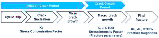 The accumulation of damage under cyclic loading is the key issue of fatigue, making it a nuanced phenomenon [8]. The fatigue life of engineering constructions is an intricate process with different phases. To simplify this procedure, engineering structure design often considers three superordinate phases: fracture initiation, fatigue crack propagation, and unstable crack growth. These phases are frequently evaluated separately. Figure 1 shows a graphic representation of the stage of the fatigue life cycle. Zhan investigated the fatigue behavior of TC4-TC11 titanium alloys through laser-melting deposition [9], while Huang et al. adopted a damage mechanics approach to examine the effects of overload on notched specimen fatigue, combining residual stress and plastic damage [10].