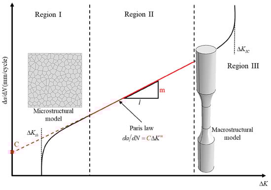The Paris law frequently illustrates the propagation of long cracks (as shown in Equation (1)). It develops a relationship with the stress intensity factor (SIF) K, which occurs at the crack’s tip during the steady crack growth duration and the fatigue crack growth rate, which is also known as FCGR or da/dN [19,20].