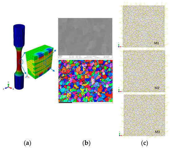 Two-scale models illustrating macrostructure as a global model and 3D submodel (a), SEM and EBSD image (b), and three artificial microstructures (submodel) derived from EBSD image (c).