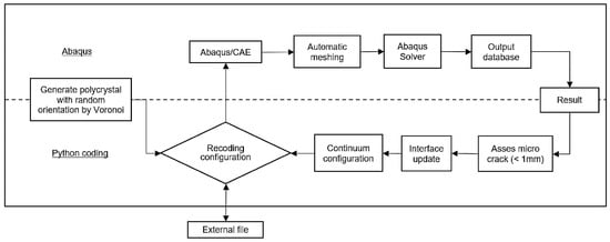 A physical model represents a real model of an object or system. It is designed to represent, simulate, or predict the behavior of the actual object or system in the real world. This model is applied when conducting experiments or gathering data would be impractical, costly, or impossible. Numerical simulations of crack initiation were carried out using ABAQUS [32], which included a plug-in for the TMM and VT, to specifically address micro-crack nucleation. The ABAQUS scripting interface is used by the Python code that invokes the graphical user interface [33]. The execution, in this case, consists of two parts: Python programming, which manages and directs the simulation procedure, and ABAQUS, which handles tasks such as pre-processing, solving the actual finite element (FE) problems, and post-processing (Figure 6).