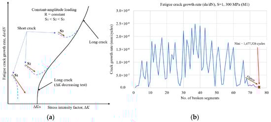 (a) Fatigue crack growth for rate for short and long cracks (data from Ref. [38]); (b) fatigue crack growth rate in case of retardation for stress level 300 MPa (M1).