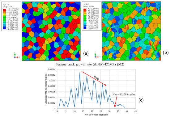 The micro-model shown in Figure 9b contains a nucleated MSC, in which the shear stress distribution field can also be recognized. The projected number of cycles needed to complete initiation is shown in Figure 9c on the basis of the above conditions. In this specific instance, 15,283 cycles are required for a stress level of 425 MPa at microstructure 2 (M2). Short cracks are defined as those having a depth of less than 1 mm, as stated by Anderson [30]. Most fatigue fractures remain in the short crack phase for the bulk of their lifetime. Thus, learning about the characteristics of these flaws is of great practical importance.