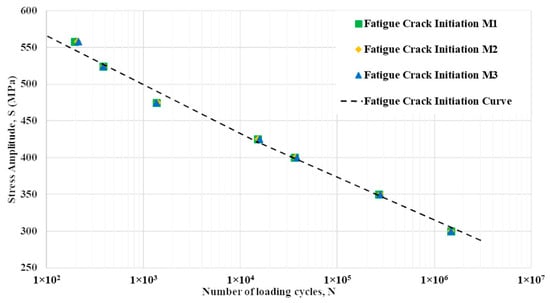 On the basis of the EBSD image in Figure 3b, three separate micro-models mirroring a particular microstructure were chosen for the numerical investigation of fatigue crack initiation lifetime. These models were subjected to seven stress amplitudes at room temperature: 300, 350, 400, 425, 475, 524, and 558 MPa. Figure 4 depicts the experimental results obtained by the School of Mechanical Engineering at UiTM Shah Alam, Malaysia, serving as a premise for comparison with the simulated outcomes. The fatigue test with stress amplitudes of 350, 400, and 524 MPa was not conducted experimentally due to the limitation of specimens and to observe the pattern of the number of cycles from TMM. The grains subjected to the maximum stress levels, typically the weakest grains expected to initiate the first MSCs, were identified by using an Abaqus plug-in enhanced with the TMM. Figure 9b shows the microcrack model in which the shear stresses change between grains and within each grain due to the orientation of each grain and the load applied. The TMM Equation (3) indicates that this result means the first microcrack starts along the grain slip line with the shortest expected lifetime.