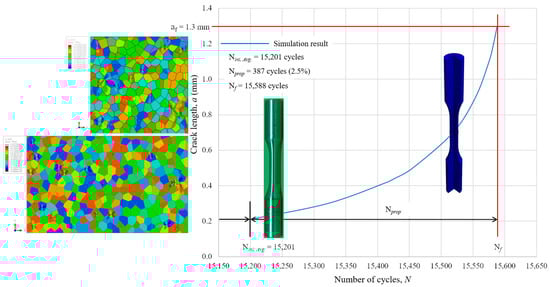 The critical SIF is determined to be at the crack length of 1.3 mm, which is nearly close to the experimental value mentioned above. The number of cycles it would take for a crack initiation to propagate and cause failure is estimated by using the Paris law. Figure 11 depicts how this was accomplished by drawing a vertical line from the intersection of the curve (the blue line) and the crack length, . The total number of cycles () from both simulations is further explained in Figure 11, including fatigue crack initiation () and propagation ().