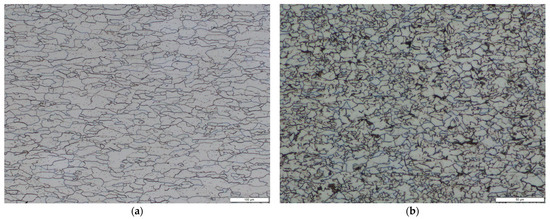 The calculation procedure described in previous section was validated with physical tests. Specimens A–D (described later in Section 3) made from materials DC04 and S420MC were used for this purpose. The microstructure of DC04 (Figure 1a) includes ferrite grains. The grain size is inhomogeneous. Figure 1b shows the microstructure of S420MC where fine grain size can be observed. DC04 is a cold rolled low strength steel, S420MC is a hot rolled low alloy steel.