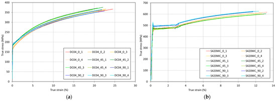 Stress-strain curves of DC04 (a) and stress-strain curves of S420MC (b).