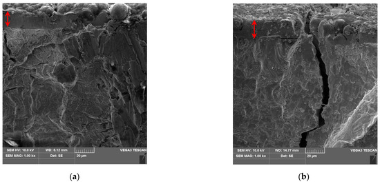 Especially if loading force amplitude is low, then there is a significant difference in the fatigue results. Voorwald et al. [37] measured the fatigue of steel samples with various surface layers. The test results from specimens with Zn-Ni coatings were highly dependent on the coating thickness. Specimens with coatings thicker than 15 µm had a shorter lifetime than specimens with thinner coatings or specimens without any coating. Our results are in agreement with this. It can be concluded that the thicker the coating, the greater the decrease in the fatigue life of the samples. From our and Voorwald’s results [37], it can be seen that at lower load levels, where more cycles are achieved, this difference is much more noticeable. For higher load levels and thus lower number of cycles, the results of fatigue tests on coated and uncoated samples can be considered identical. [38] describes the ways in which fatigue damage to coated components occurs. The first way of failure is the delamination of the coating and the base material (substrate). The crack formed at the interface between the coating and the substrate gradually spreads until it penetrates the substrate. The second way of failure is the formation of a crack directly in the coating. The crack arises as a result of the lower mechanical resistance of the coating and gradually propagates into the substrate. Our observations show that the second mode of damage dominates the fatigue damage of our samples. This is due to the fact that the mechanical resistance of the coating is lower than the mechanical resistance of the substrate and at the same time the Zn-Ni coating exhibits good adhesion to the substrate, so delamination does not occur. Moreover, coating increases surface roughness, which negatively affects fatigue life too. Coating also increases the surface hardness. A harder surface behaves more brittlely and thus again the fatigue life is reduced.
