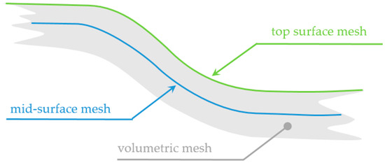 An algorithm of inverse stamping is formulated for shell structures [23,24,25]. If the metal sheet thickness is high compared to the body curvature then it makes more sense to model the calculated body as a volumetric body. Also, if a 3D scan [26] is used as the input for inverse stamping then it is helpful to use a volumetric model in the calculation. This means that the inverse stamping algorithm needs to be adapted from shell structures to volumetric structures. This adaptation is described below.