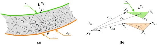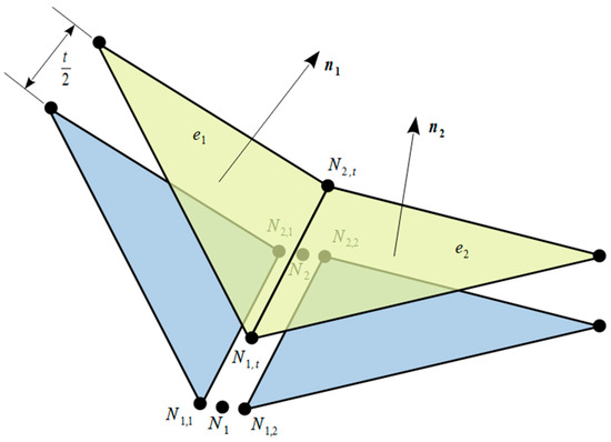 The wall thickness is automatically recognized as the difference between the top surface mesh and bottom surface mesh. Figure 6a shows a cross-section through the volumetric mesh. The top surface mesh element e1 with nodes Ni (i = 1, 2, 3) has external normal n1. The candidate for the opposite element on the bottom surface mesh is found and the intersection point P is calculated. The radius vector rP of point P is given by Equation (1)