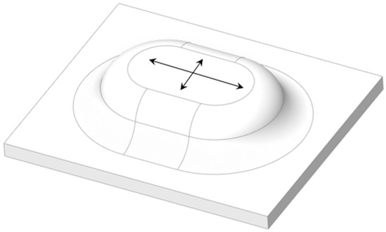 It was mentioned in Section 1 that there are methods based on a part’s local curvature. This approach has some limitations. For example, the protrusion in Figure 7 has theoretically zero curvature on its top, but there is non-zero plastic strain as indicated by the arrows. Inverse stamping is able to calculate plastic strain even in these spots.