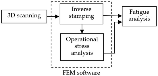FEM models were compiled and used for operational stress analysis and inverse stamping analysis. The advantage of this approach is that no results mapping is needed because one mesh is used for both calculations. Operational stresses and inverse analysis results were then used to estimate fatigue. The workflow is shown in Figure 11.