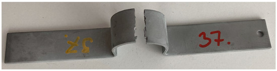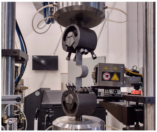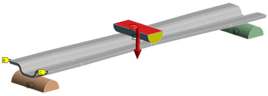 Figure 12 shows the set-up used for operational stress analysis of the A and B sample types. It is a three-point bending test, where the sample is supported at two points and a piston loads the body in the middle. The piston force is represented by the red arrow. The distance between the supports was 150 mm for the A specimens and 350 mm for the B specimens. Figure 13 shows sample D in a testing machine. The jaws of the testing machine moved up and down with a symmetrical loading force.