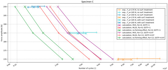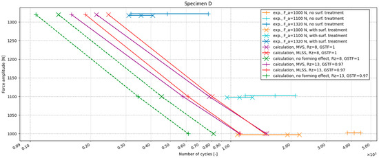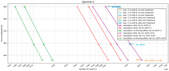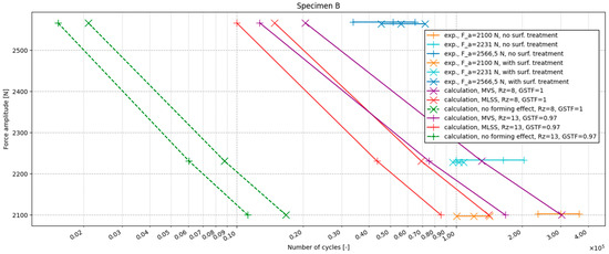 Results from the calculations are represented by non-horizontal lines. Three calculation methods were compared to find a favourable calculation set-up. The first calculation method (green dashed line) did not consider the effect of plastic strain originating during forming. The second calculation was done using the MLSS method (blue dashed line) and the third one was done using the MVS method (orange dashed line). Markers “x” denote calculations where influence of coating wasn’t considered. Only surface roughness Rz = 8 µm was considered via surface roughness factor according to [39]. Markers “+” denote calculations where surface roughness Rz = 13 µm was considered via surface roughness factor and where a GSTF of 0.97 was used. The purpose of this is to consider the effect of coating. It can be seen from all the graphs that the inclusion of the effect of effective plastic deformation brings the calculation results closer to the experimental results.