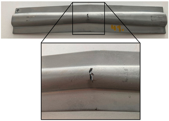 According to [10], plastic strain originating during forming should not be higher than the material’s uniform elongation. The same publication states a uniform elongation value of 23.3% for DC04 material. Results of our measurement shown in Table 2 agree with that. Uniform elongation of the S420MC material is about 13% based on our measurement shown in Table 2. This condition is not fulfilled for whole bodies, but it is satisfied in spots where rupture was expected. In Figure 18 and in Figure 19 these spots are marked ‘spot of rupture’.