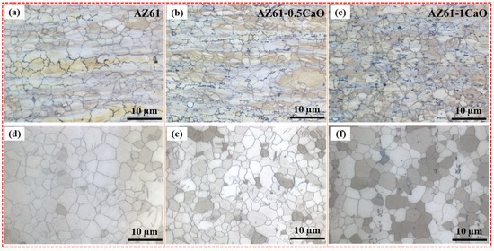 OM images of non-annealed and annealed samples of (a,d) AZ61, (b,e) AZ61-0.5CaO and (c,f) AZ61-1CaO.