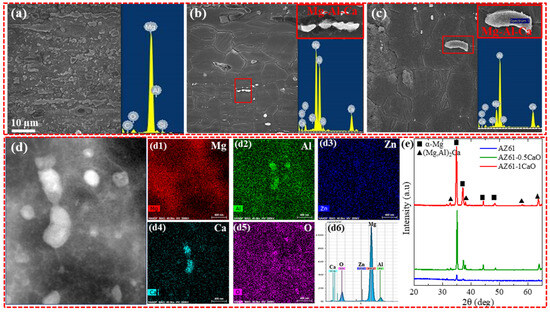 Figure 2a–c show the SEM images with EDS spectra entailing the area and point analysis of AZ61, AZ61-0.5CaO and AZ61-1CaO, respectively. It can be seen that AZ61-0.5CaO contains large-sized Mg-Al-Ca compounds within the Mg matrix. Here, the formation of Mg-Al-Ca compounds can be attributed to the low solubility of calcium within the Mg matrix. The increase in CaO content from 0.5% to 1% led to higher formation of Al2Ca compounds. This is because the higher concentration of Ca likely exceeds the threshold required to form stable Mg-Ca-rich compounds. Further TEM/EDS analysis of AZ61-1CaO (Figure 2d) confirms the formation of Al2Ca compounds distributed in the Mg matrix. It is noteworthy that the formation of common brittle phase (Mg17Al12) in Al-Zn Mg alloys is repressed significantly because of Al consumption in forming Al2Ca or (Mg, Al)2Ca phases, which is consistent with previous studies [34,35,55,56,57]. In addition, it was in accordance with the XRD patterns of AZ61, AZ61-0.5CaO and AZ61-1CaO as shown in Figure 2e, where new peaks related to (Mg, Al)2Ca can be seen.