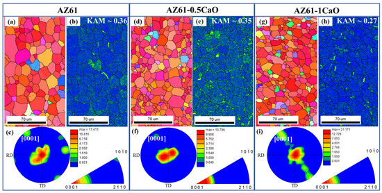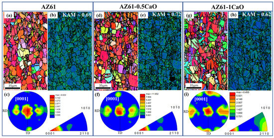 EBSD analysis including the (a,d,g) inverse pole figure map, (b,e,h) Kernel average misorientation map and (c,f,i) (0001) pole figure for non-annealed AZ61, AZ61-0.5Ca and AZ61-1CaO, respectively.