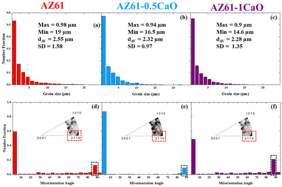 Grain size distribution and misorientation angle distribution of the non-annealed AZ61 (a,d), AZ61-0.5Ca (b,e) and AZ61-1CaO (c,f).