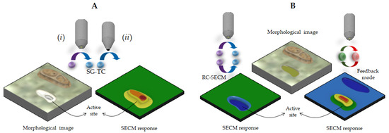 Schematic of the various operation modes in SECM, where yellow-red colours correspond to positive signals (i.e., current or potential) and blue colour reflects signals below those registered over inactive areas (green coloured). (A) Substrate generation-tip collection (SG-TC) mode responding to concentration gradients of target species on active sites through (i) its electrochemical conversion at an amperometric tip or (ii) selective potentiometric detection using an ion-selective tip. (B) Amperometric redox-competition (RC-SECM) and feedback responses on a surface exhibiting active domains and topographic features. RC-SECM exhibits current decrease (more negative) over the active domains competing for the same sensed species.