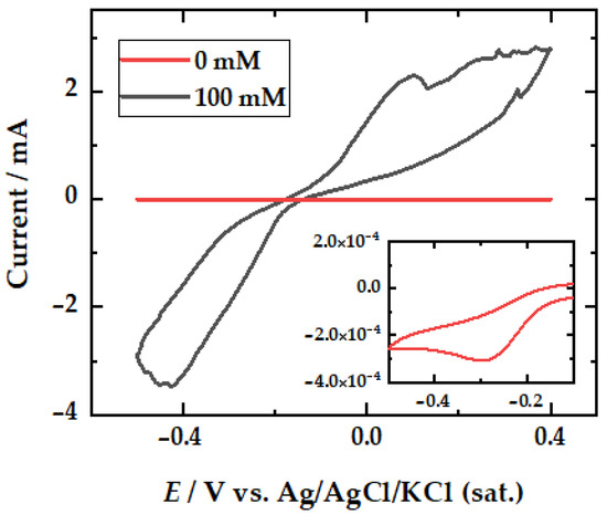 Cyclic voltammograms recorded for a gold electrode of 500 µm diameter in 3.5 wt.% NaCl + x mM CuCl2 solutions adjusted to pH 3.5 (with x = 0, 100 as indicated in the figure). Scan rate: 0.05 V s−1. The inset shows an enlargement of the plot obtained for the solution not containing CuCl2.