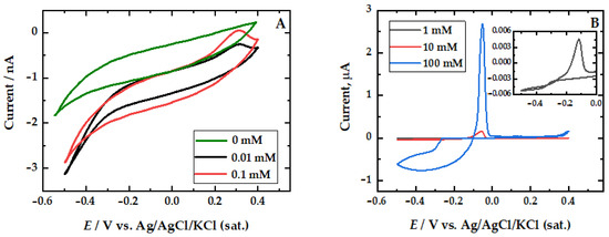 On the other hand, the cyclic voltammogram measured at the microelectrode in the solution containing 100 mM CuCl2 in Figure 3B provides different information from that provided by the macroelectrode under the same conditions, consistent with other reports conducting deposition and dissolution of copper in gold microelectrodes [45]. When the applied potential is sufficiently cathodic to cause the reduction of the Cu2+ cations on the gold microdisc without kinetic interference, a current peak is defined as the current becomes controlled by mass transfer (diffusion). Since the gold surface has become completely covered by metallic copper, the subsequent reduction of copper ions is deposited on metallic copper instead of gold, leading to a greater electrode area that is observed as a small current increase at a potential close to the anodic switch potential. Copper dissolution occurs during the cathodic sweep at potentials below 0 V. From the foregoing, not only does it seem convenient to use microelectrodes to detect the amount of Cu2+ ions present on a surface generating a local response, but even at relatively high concentrations such as 0.1 M, the detected signals are better defined and more quantifiable in the case of microelectrodes due to the dependence of the current on diffusion processes.