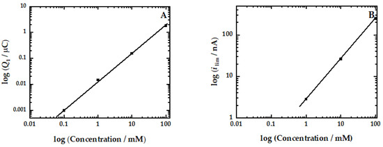 Dependence with the concentration of Cu2+ ions for selected signals observed in the voltammetric data of Figure 3. (A) Integration of the voltammetric peak occurring in the cyclic voltammograms around −0.1 V and (B) limiting cathodic current measured at −0.3 V.